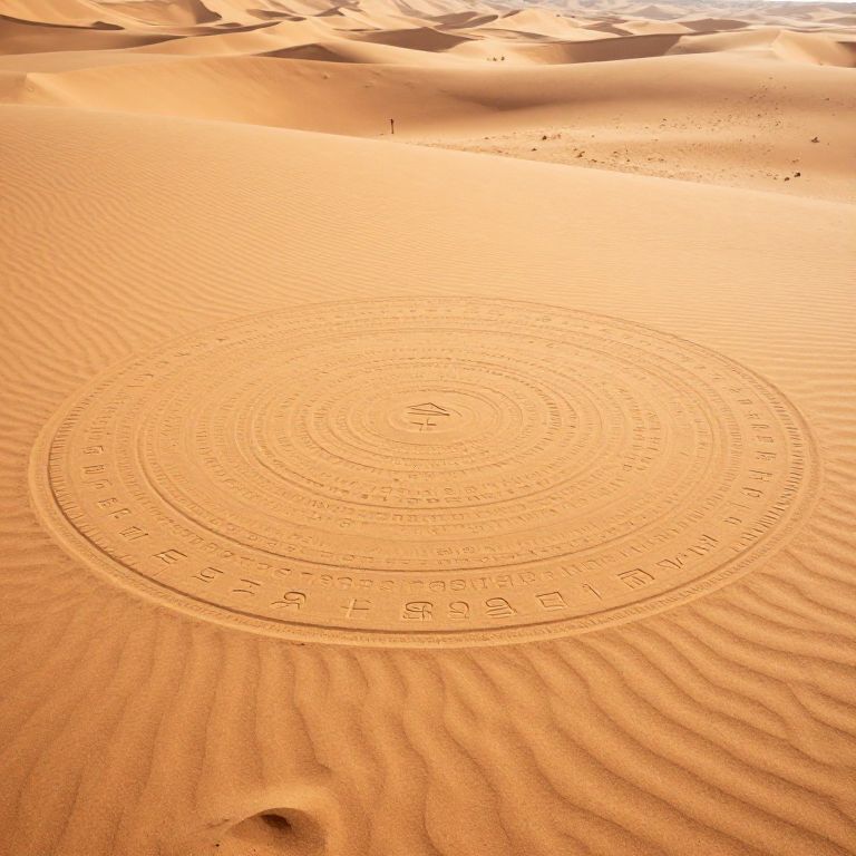 A vast desert sandscape transforms into a mesmerizing tapestry of concentric circles etched with ancient symbols and cryptic inscriptions, defying the natural erosion of time and revealing hidden truths beneath the shifting dunes.