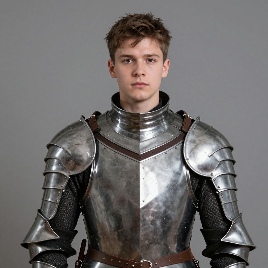 Knight armor costume adult, solo, 1boy, male focus, armor, realistic, looking at viewer, upper body, brown hair, closed mouth, shoulder armor