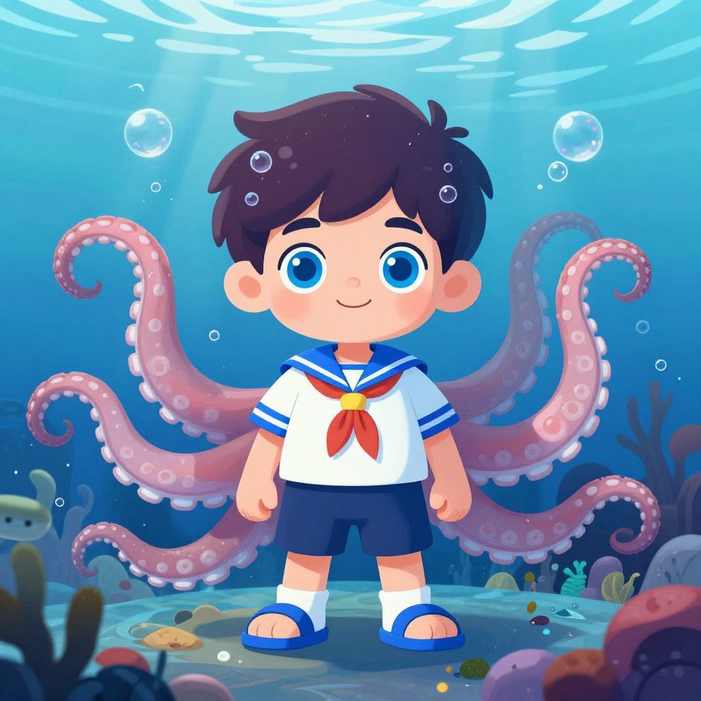Cartoon boy with black hair, blue eyes, and octopus tentacles underwater, wearing sailor shirt, shorts, and blue sandals, surrounded by bubbles