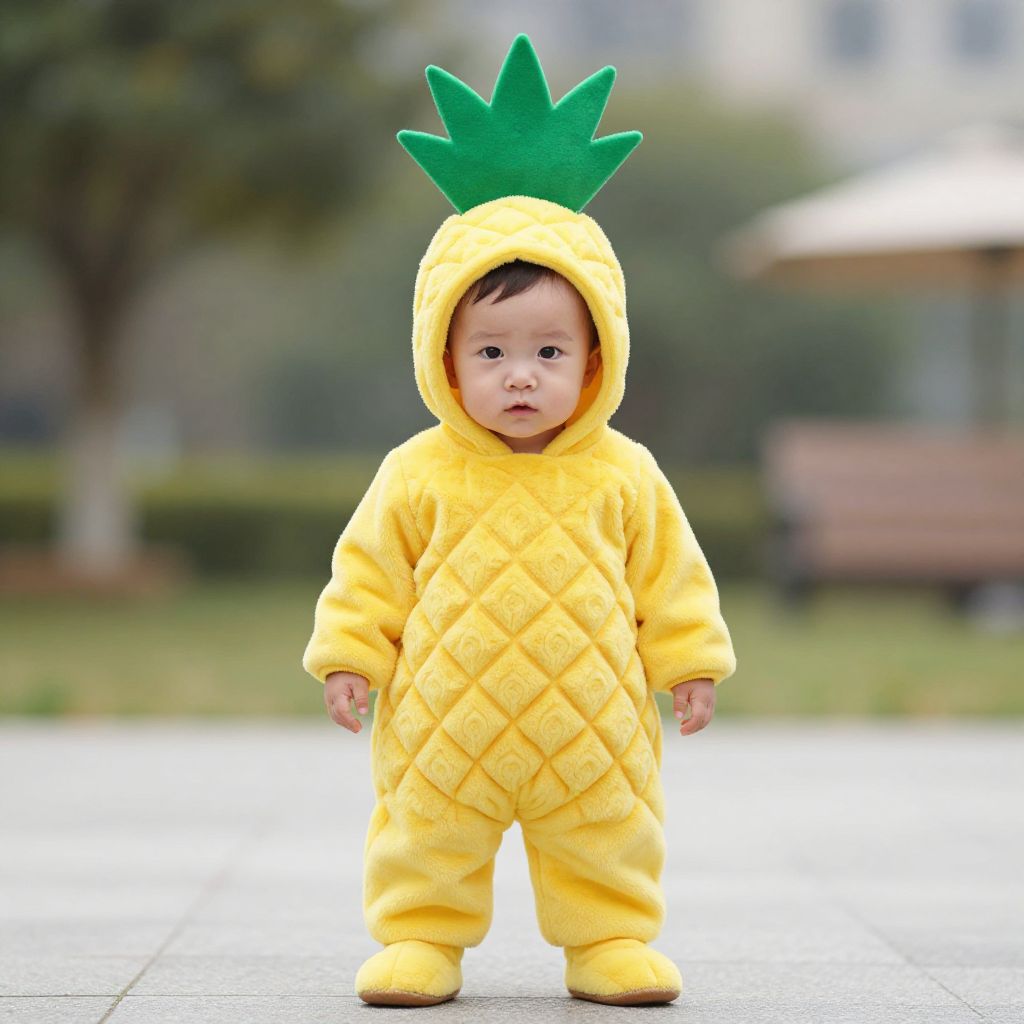 Perfect pineapple infant, solo, male focus, 1boy, standing, looking at viewer, hood, outdoors, blurry background, blurry, full body, costume