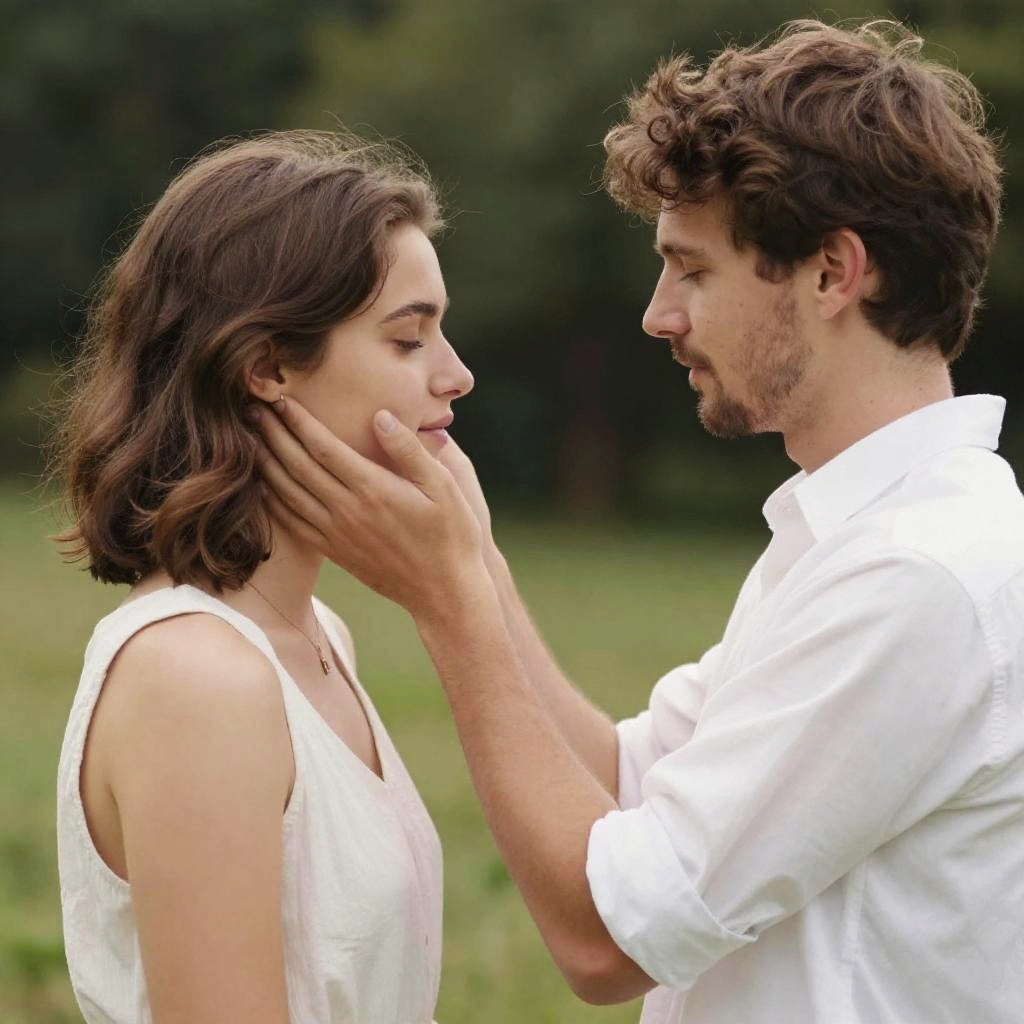 1girl, 1boy, short hair, facial hair, blurry background, brown hair, blurry, dress, closed eyes, shirt, mustache, white shirt, hands on another's face, beard, outdoors, open mouth, profile, child, sleeveless, from side, upper body, sleeveless dress, realistic, day, mole