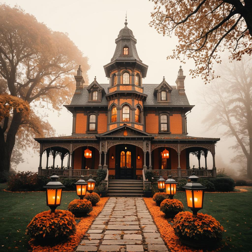 A charming Victorian-style house with intricate architectural details, featuring a tall tower and orange-painted walls. The scene is set in an early autumn morning with fog surrounding the area. The front yard is decorated with ambient orange lanterns and vibrant orange flowers lining a winding stone pathway leading to the entrance, creating a warm and cozy fall atmosphere.