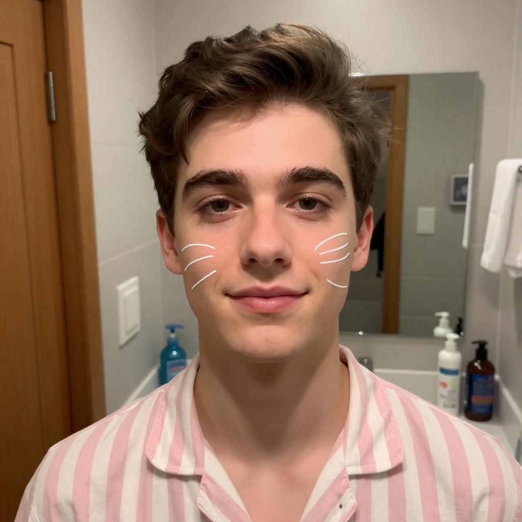 Photograph of a young man with short brown hair and fair skin, wearing a pink and white striped shirt, standing in a bathroom. White abstract lines superimposed on his face. Background includes a mirror, wooden door frame, and various bathroom items on a counter. He has a slight smile.