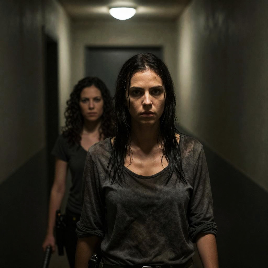 Photograph of two women standing in a dimly lit narrow hallway with concrete walls and a door at the end. The woman in the foreground has wet black hair, an intense expression, and is wearing a dirty gray shirt. She is holding a gun at her side. The woman in the background has curly hair, is slightly out of focus, and also appears to be holding a weapon. The setting conveys a tense and dramatic atmosphere.