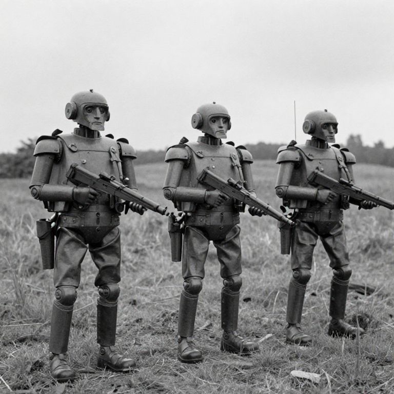Black-and-white photograph of three robotic soldiers standing in a grassy field, each holding a rifle, wearing helmets and armor.