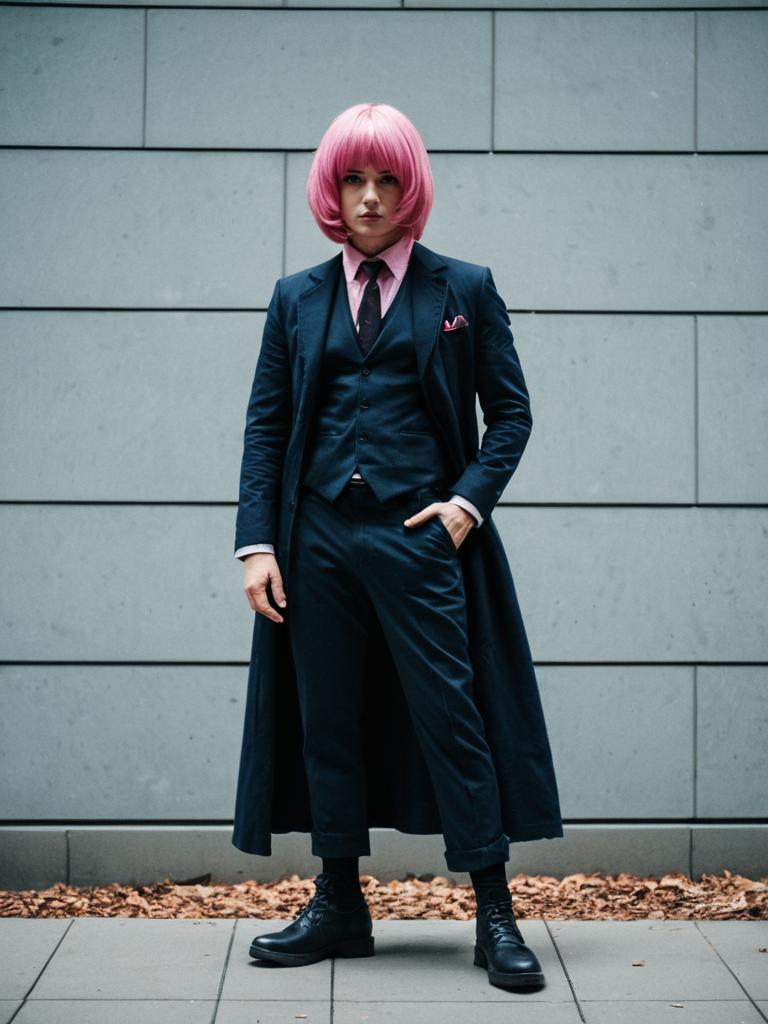 Full-body portrait of a person wearing a long dark coat, black vest, black pants, and a pink shirt with a tie. The person is wearing a bright pink wig styled like the character Anya Forger from the manga and anime series 'Spy x Family'. The outfit is complemented by black boots and a matching pink pocket square. The background features a gray tiled wall and fallen leaves on the ground.
