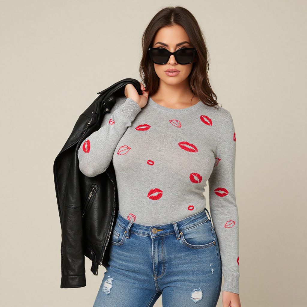 "Woman, streetwear, graphic tank top with colorful emoji print, round neckline, sleeveless, black distressed denim shorts, mid-rise, frayed hems, black leather biker jacket held in one hand, multicolored reflective round sunglasses, chunky gold bracelet.. Sexy. Pretty face and beаutiful eyes. Big breasts."