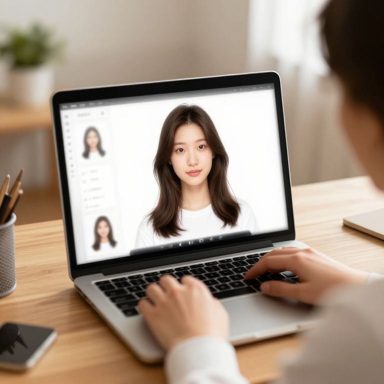 How to check which hairstyle suits my face online, a cozy home office setting with a person sitting at a desk using a laptop, virtual hairstyle overlays on their photo on screen, warm natural light, digital art with a friendly atmosphere.