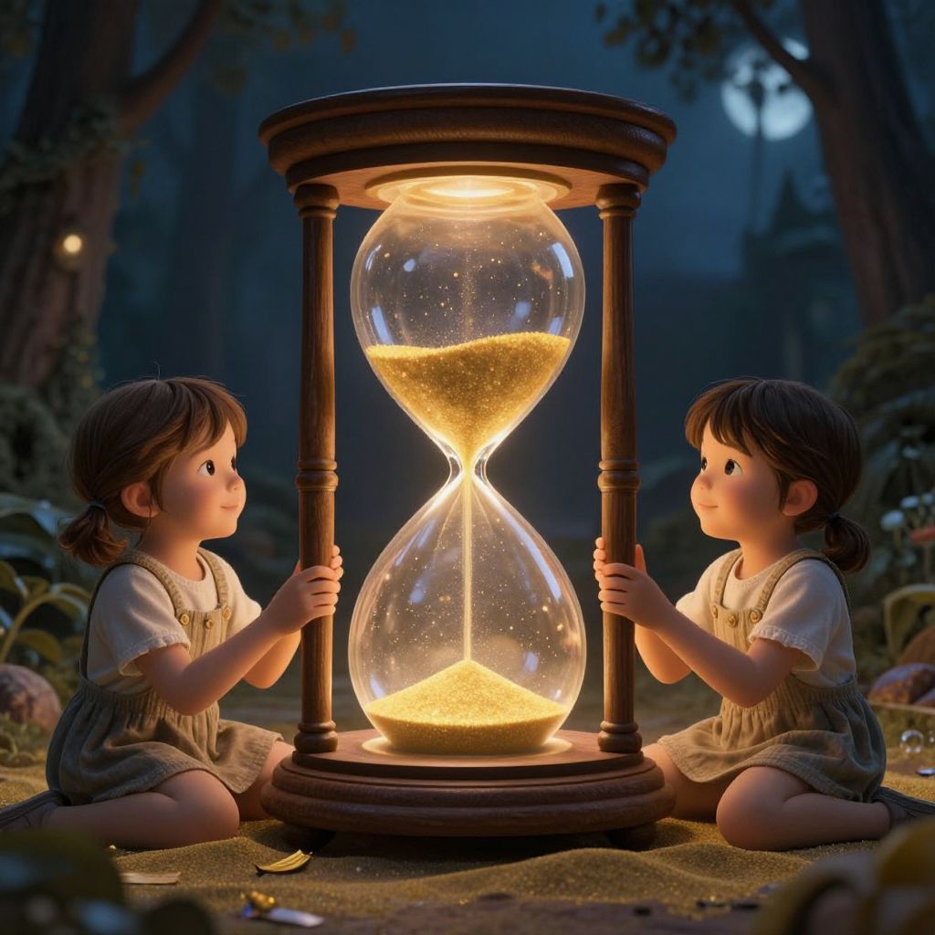 Suspended between past and future, a luminous hourglass cradles a sanctuary of wonder, where time whispers secrets to children bathed in golden sand, their laughter echoing like the soft hum of eternity.