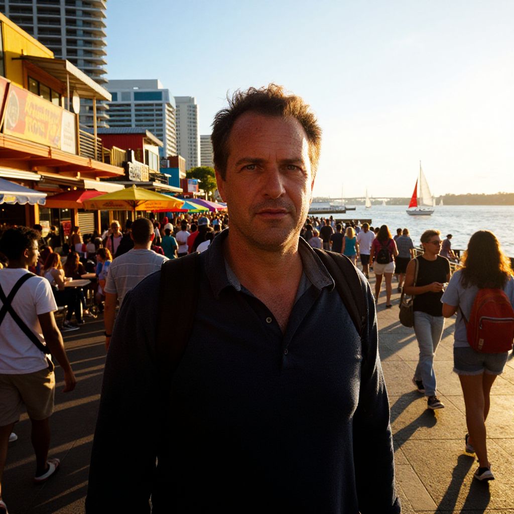 Photograph of a middle-aged man with short, dark, slightly spiky hair, wearing a dark, button-down shirt, standing in the foreground of a bustling waterfront promenade. He has a rugged, serious expression. The background features a crowded, sunlit street with people walking, red and yellow umbrellas over outdoor restaurants, and modern high-rise buildings. The sun is low, casting long shadows and creating a bright, warm glow. A red sailboat is visible on the water to the right. The image has a vibrant, high-contrast style with vivid colors.