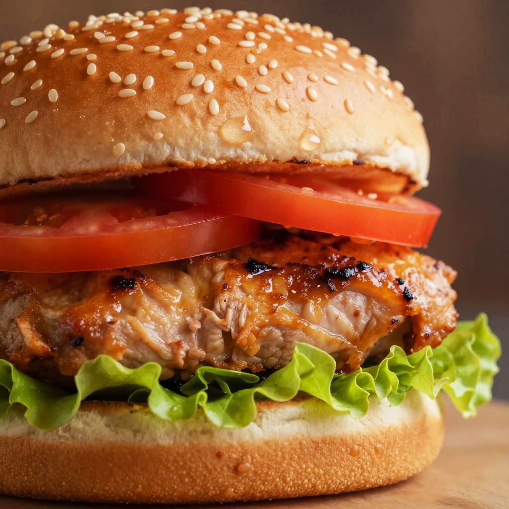 Photograph of a juicy, grilled chicken burger with a sesame seed bun. The burger features fresh green leaf lettuce, thick slices of red tomato, and a succulent, caramelized chicken breast sandwiched between the bun. The textures contrast with the soft, slightly toasted bun, crisp lettuce, and juicy tomatoes. The background is a blurred, dark wooden surface, emphasizing the vibrant colors and textures of the burger. The image highlights the appetizing appearance of the burger, making it look deliciously inviting.