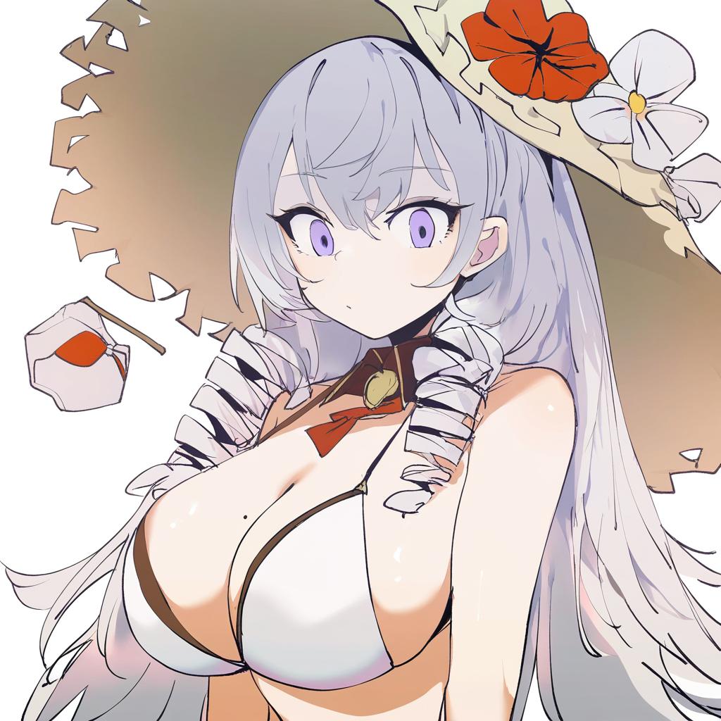 Algerie (azur lane), azur lane, 1girl, purple eyes, hair between eyes, mole under eye, grey hair, long hair, very long hair, white hair, large breasts, mole on breast, cleavage, white bikini, two-tone bikini, straw hat, hat flower, bare shoulders, twin drills, drill sidelocks, by artist ddari, leet