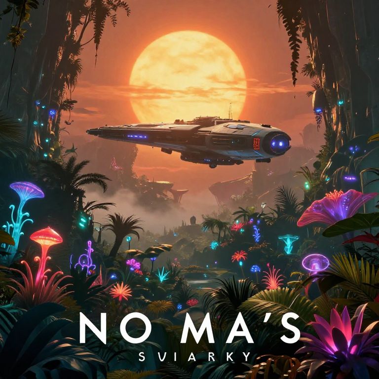 Digital art: Glowing, colorful alien forest at sunset, with a futuristic spaceship hovering above. "NOMA'S SUIARKY" text