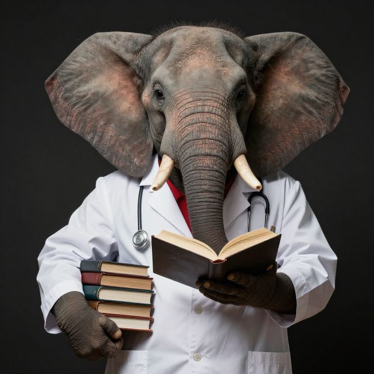 The image depicts a striking portrait of an elephant, dressed in a white doctor's coat that contrasts with its gray skin. The elephant's large, expressive eyes and trunk are prominently featured, giving it a thoughtful and intelligent appearance. In its trunk, the elephant holds an open book, suggesting a scholarly or intellectual theme. The coat is adorned with buttons and a red inner lining, adding to the detailed and realistic portrayal. The elephant's ears are wide and flared, and it stands confidently, holding a stack of books in its other hand. The background is dark, which makes the elephant and its attire stand out even more, creating a dramatic and engaging visual. The overall composition is balanced, with the elephant as the central figure, surrounded by the books that emphasize its scholarly nature.