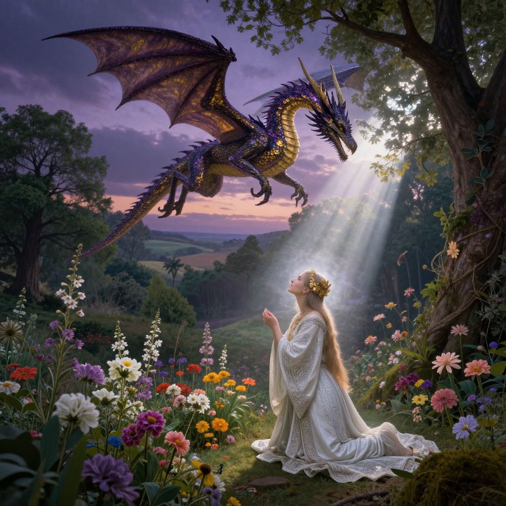 A mesmerizing tableau captures the essence of Pre-Raphaelite enchantment intertwining with the mystical allure of Norse sagas. In this ethereal scene, a resplendent dragon, adorned with iridescent scales resembling amethyst and gold, majestically traverses a twilight sky, casting dramatic silhouettes upon verdant landscapes below. As it glides over an enchanted forest, rays of celestial light penetrate the dense foliage, enveloping a mysterious woman in an ethereal embrace. Bedecked with intricate adornments echoing Dürer's meticulous engravings, she humbly kneels amidst a vibrant tapestry of blossoms, her gaze fixed upon the dragon as it recedes into the horizon. The interplay of light and shadow upon flora and fauna creates a captivating emotional spectrum, evoking an overwhelming sense of reverence, curiosity, and yearning within the observer's soul.
