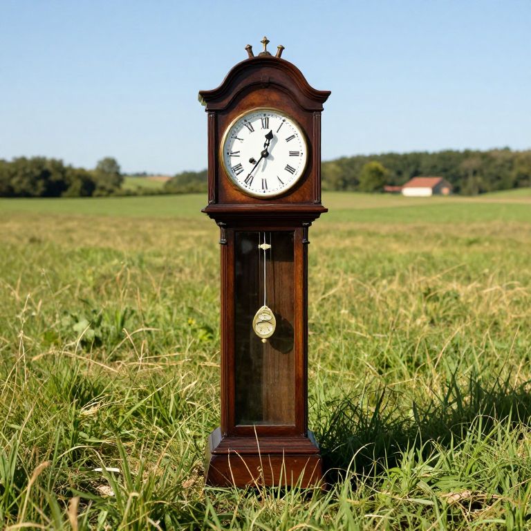 Photograph of an antique wooden grandfather clock with a white dial and black Roman numerals, standing in a sunlit, green grassy field. The clock's dark brown wood has a polished finish, and a small, round, gold-colored medallion is centered on the front. The background features a clear blue sky, a distant treeline, and a small red-roofed building. The clock is positioned centrally, with tall grass surrounding its base, creating a natural, rural setting. The sunlight enhances the clock's wooden texture and the vibrant green of the grass.