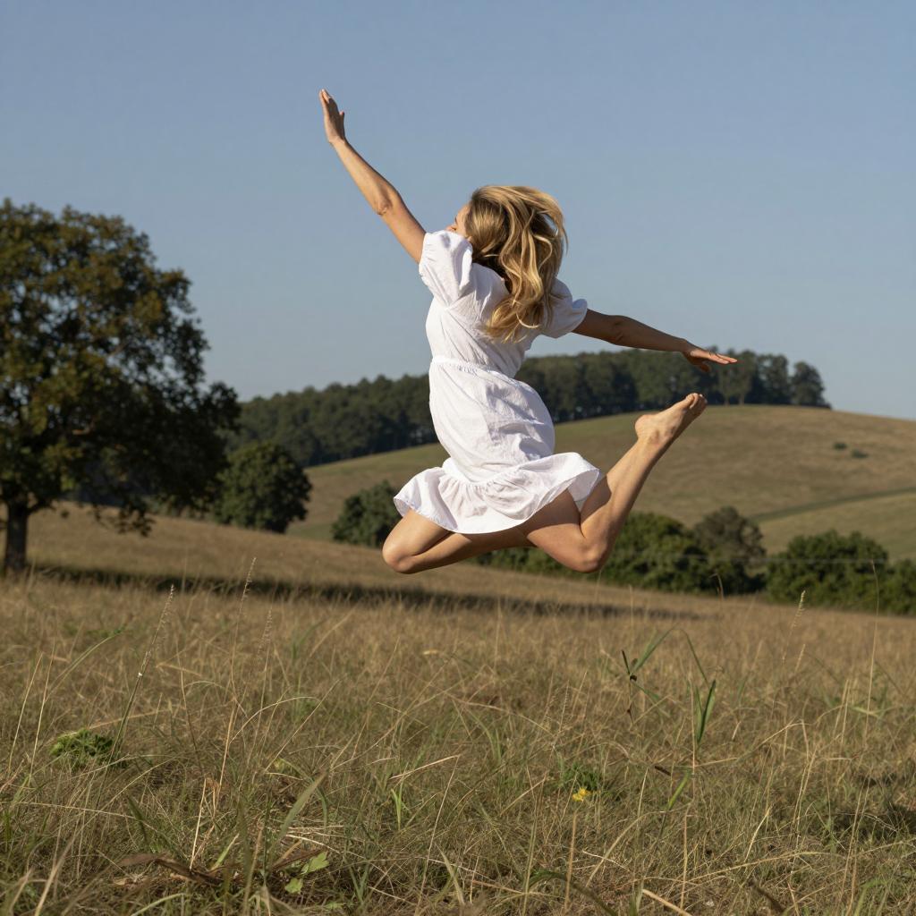 Woman in orange dress and beige hat running on gravel road. Curved road in foreground, fenced field and trees in background. Green and brown landscape, overcast sky. Single bare tree on right. Wide-brimmed hat blown by wind. Medium shot, daytime.