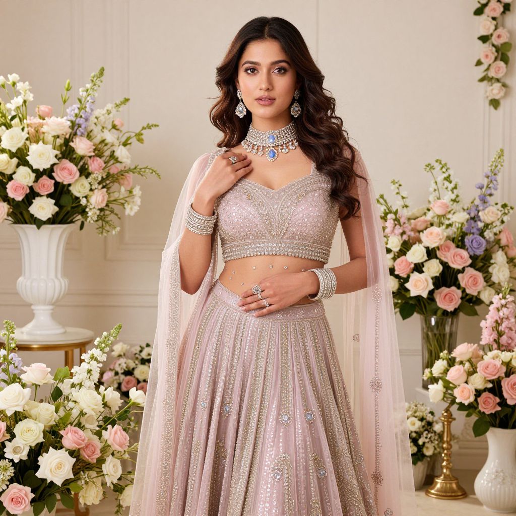 Photograph of a beautiful woman with long, wavy dark hair standing in an elegant, floral-filled room. She wears a sparkling, silver-toned lehenga choli with intricate embellishments, a sheer pink dupatta draped over her shoulders, and matching jewelry including a choker, bangles, and earrings. Her skin is a warm, medium brown tone. The background features large vases filled with pink, white, and purple flowers. The room has white, paneled walls, adding to the refined and romantic atmosphere. The lighting is soft, highlighting her elegant attire and the delicate flowers surrounding her.