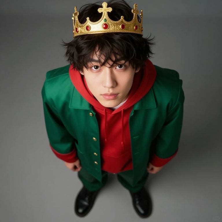 Photograph of an Asian male with medium skin tone, black tousled hair, and brown eyes, wearing a gold crown with red gems. He is dressed in a green jacket with gold buttons over a red hoodie, paired with black shoes. The angle is from above, looking down at him. The background is a plain gray studio light, emphasizing the subject. His expression is neutral, and the lighting is even, highlighting the colors of his outfit and the crown.