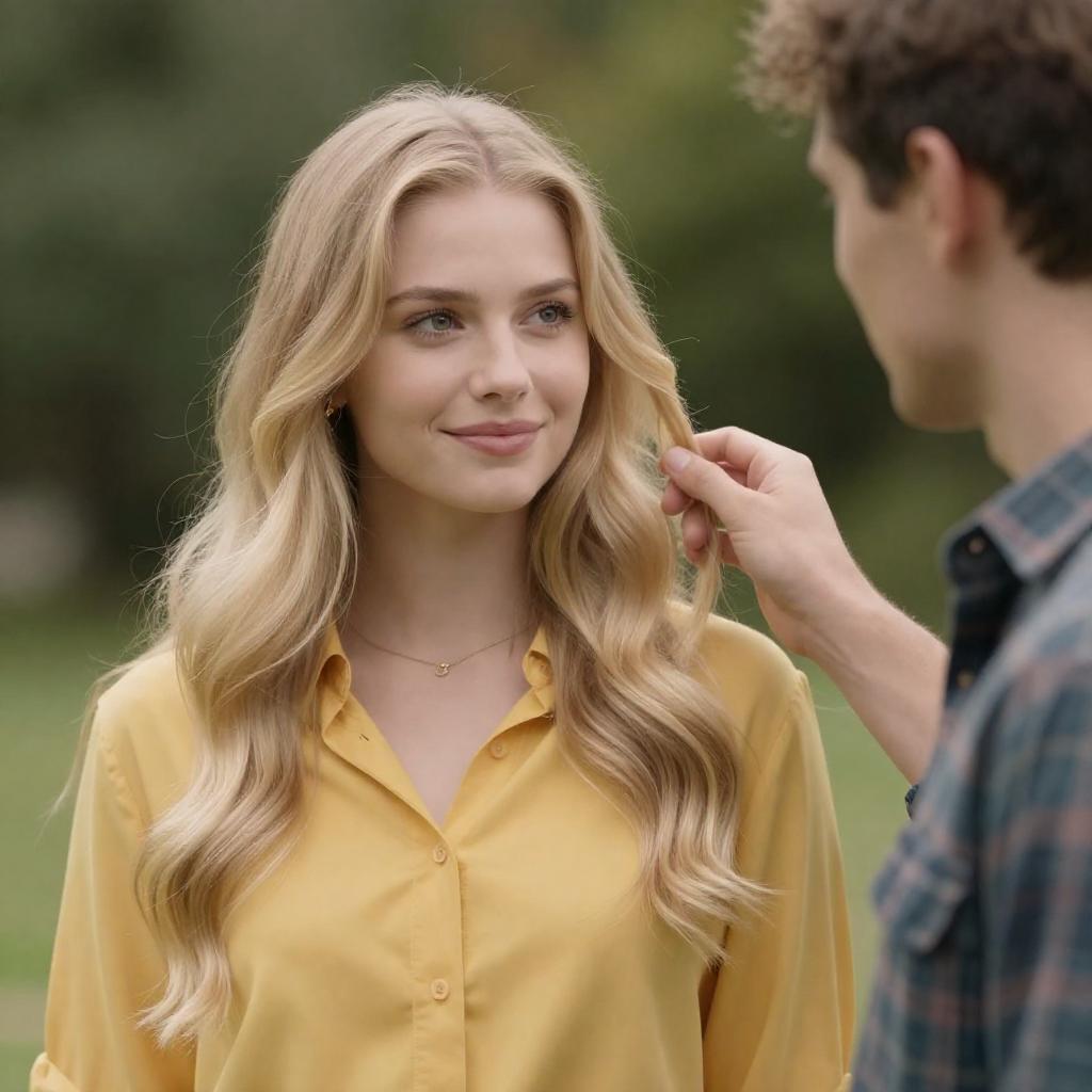 Young woman with light skin and blonde hair in a ponytail, smiling softly, wearing a dark maroon robe with a red collar, standing indoors. Soft sunlight filters through a window with brown blinds in the blurred background.
