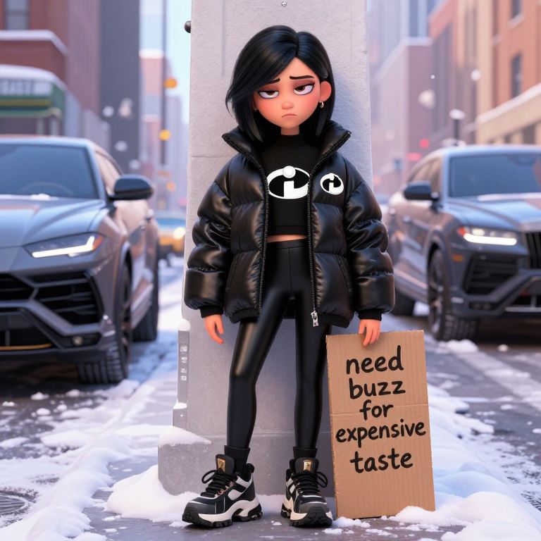 Digital artwork of Violet Parr, in a super crisp Pixar style 3d rendering from the second Pixar film of \"the incredibles\" very cynical and bored looking at viewer, wearing a super duper expensive Balenciaga oversized puffy black glossy winter Parker and an overall Hypebeast fashion style outfit, tight black latex leggings and amazing Hype sneakers with fat soles, the image reflects the iconic style of a high fashion photo shooting and the overall feeling of a spoiled generation Z girl, looking cynical, young, sleepy eyes, 22year old girl, surrounded by super suvs such as Lamborghini urus or Ferrari Purosangue, high end image, the girl is supposed to be a Billionaire Superhero, Cold winter day in New York City, snow on streets, super beautiful detailed eyes, standing at street leaning at wall, the logo on the jacket features the iconic logo from the incredibles superhero company in a black and white only style, the girl has black hair and brown eyes, She is holding up a cardboard sign that reads, \"need buzz for expensive taste\