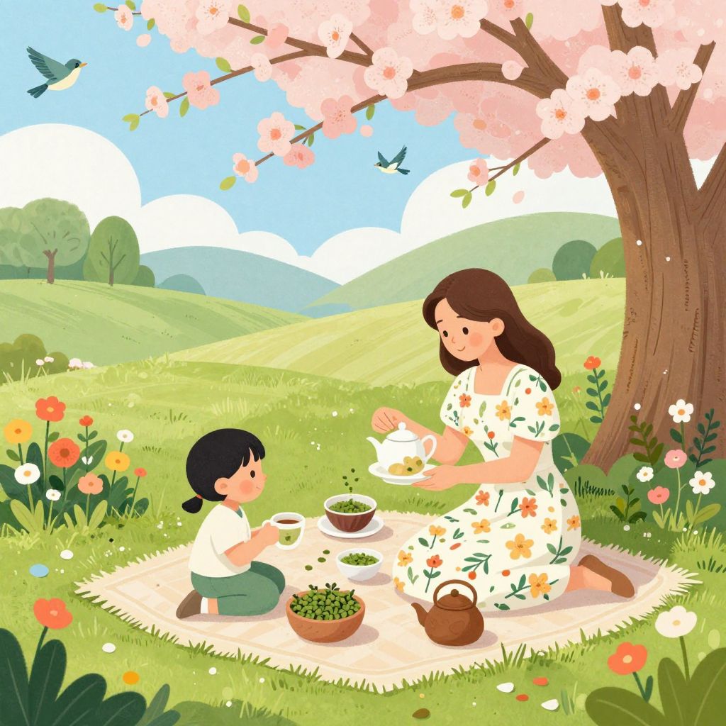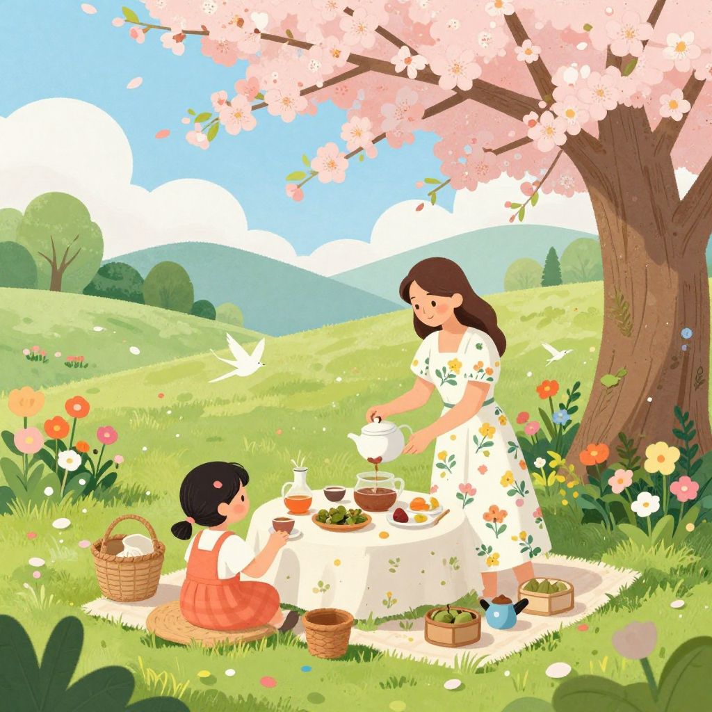 A vibrant digital illustration depicts a serene outdoor tea party under a blossoming tree, featuring a woman in a floral dress serving tea to a child, surrounded by lush greenery, colorful flowers, and flying birds, capturing the essence of a low-waste, eco-friendly gathering in a picturesque countryside setting.