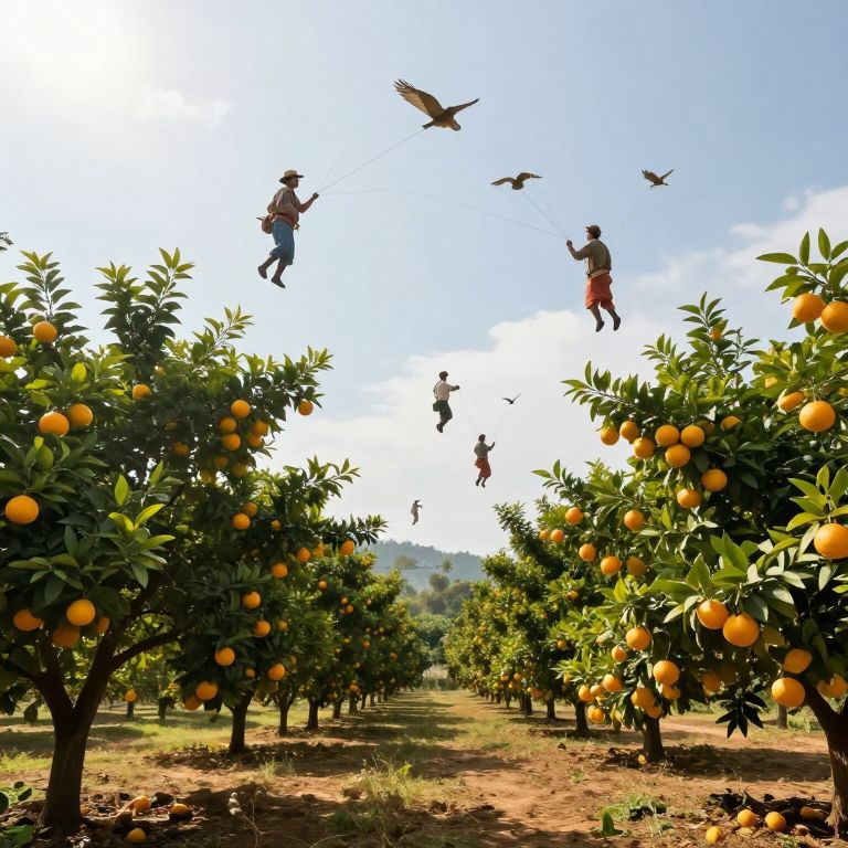 In a surreal citrus grove where gravity defies convention, farmers soar through the air, tethered to birds, plucking golden oranges from trees that float serenely above the ground.