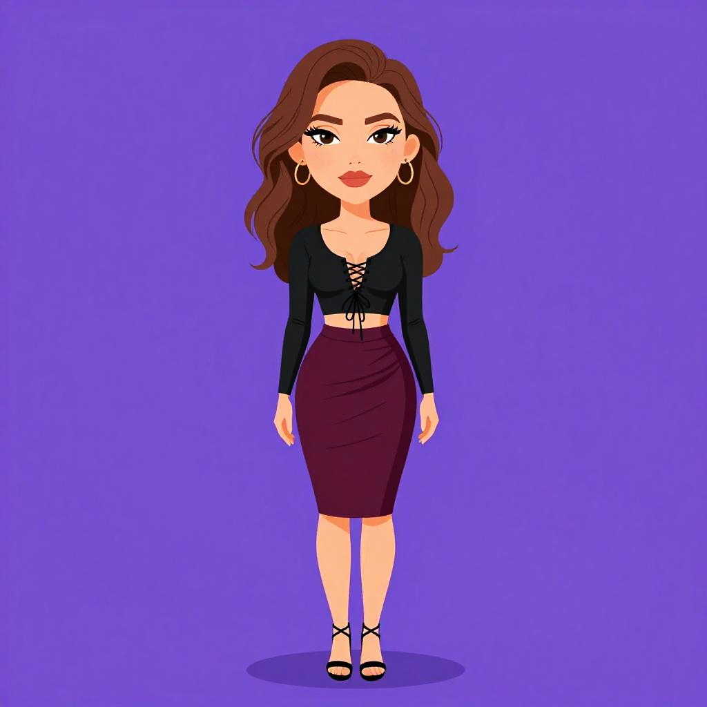 Illustration of a confident woman with long brown hair wearing a sleek black knee-length bodycon dress featuring gold sequin embellishments, halter neckline with cut-out details, sleeveless and backless design, and a side slit. She is accessorized with large gold hoop earrings, a wide gold cuff bracelet, and black strappy high heels. Set against a solid purple background.