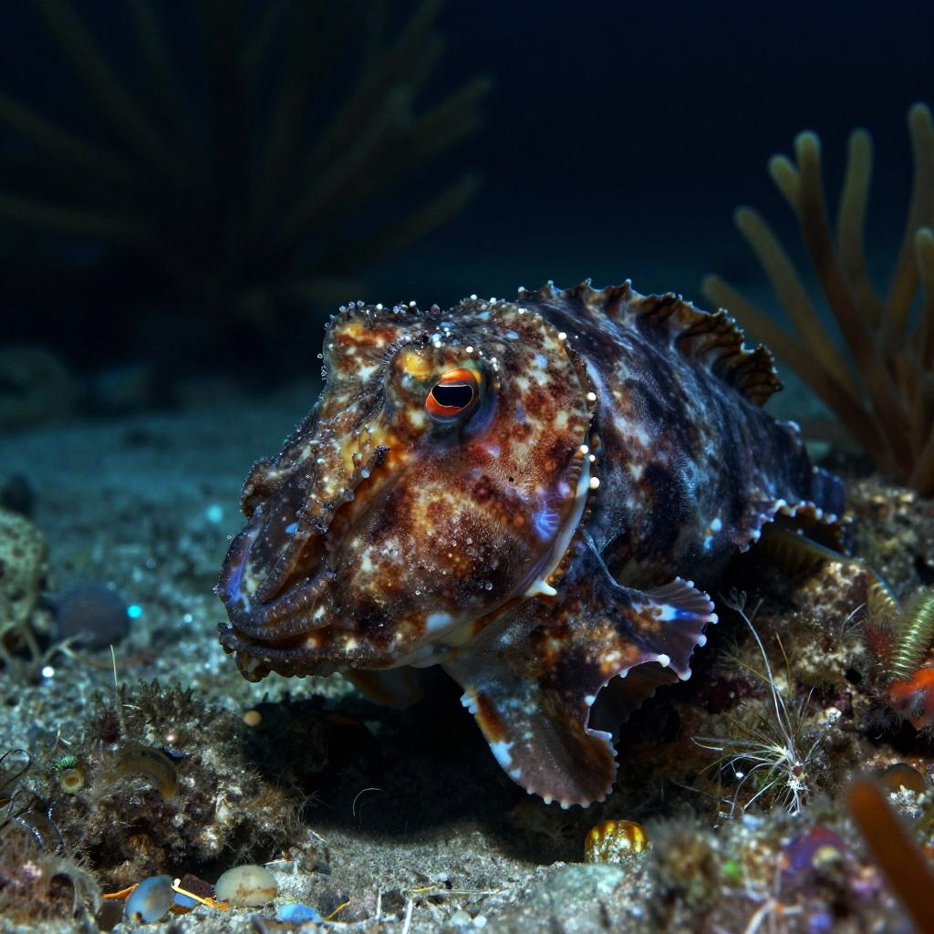 Deep sea monkfish camouflaged on rocky seabed, surrounded by deep ocean flora, detailed textures of fish and seabed, dark moody lighting, ethereal bioluminescent highlights