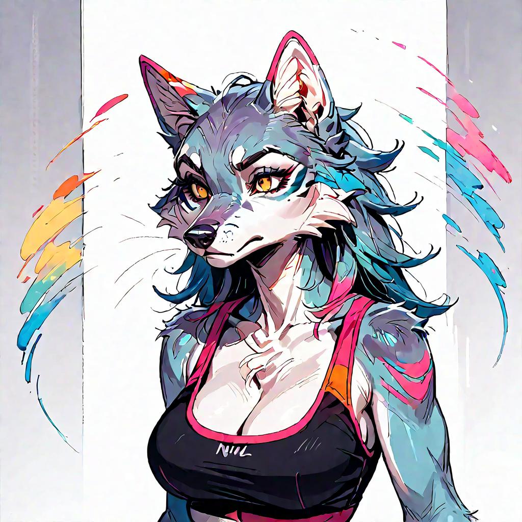 (score_9), (source_furry), (rating: questionable), anthro female wolf, in a hotel, attractive wolf face, cleavage, sports bra