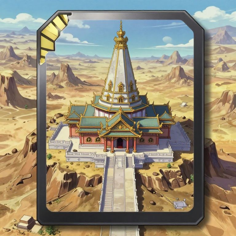 Digital illustration of an ornate, golden-roofed temple with a tall spire, set in a desert landscape, viewed through a black-framed