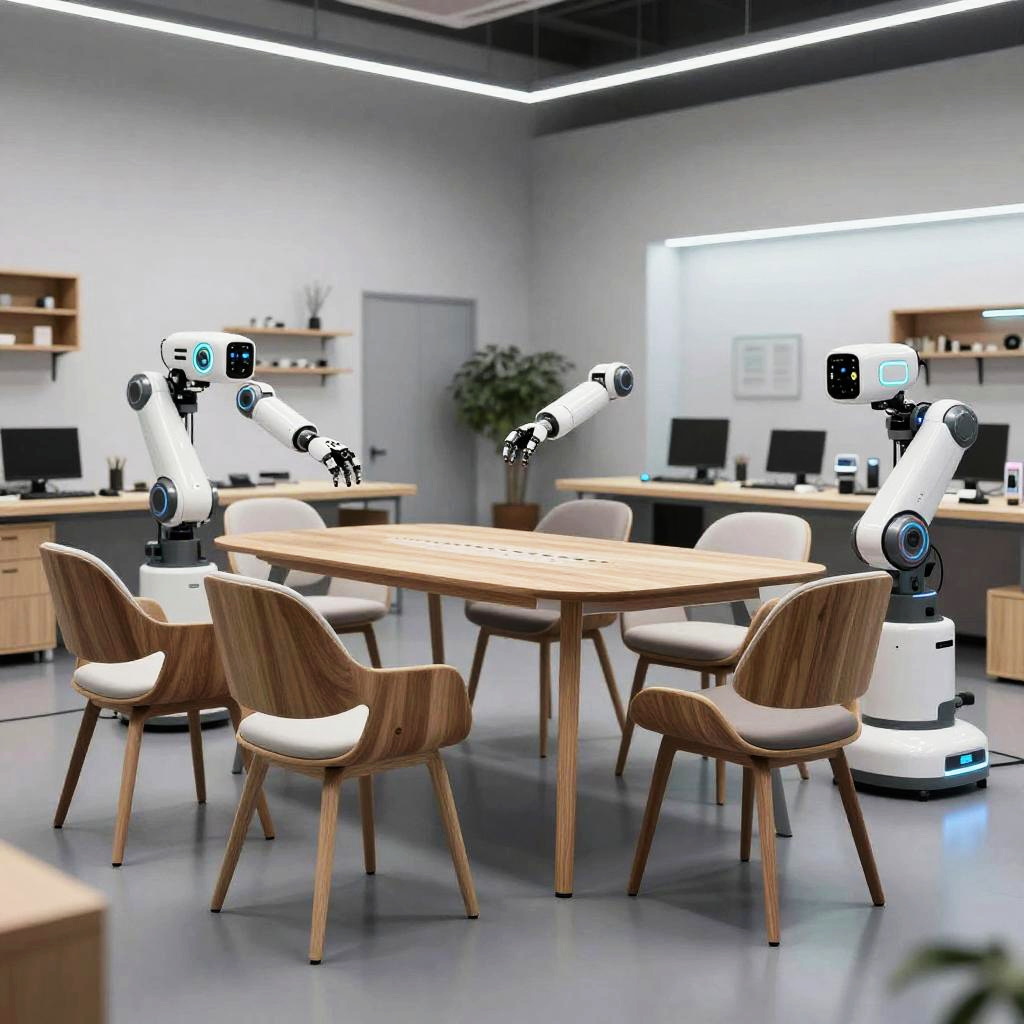 AI for furniture design concept showcasing a futuristic workshop with intelligent robots crafting elegant, modern chairs and tables, blending advanced technology with sleek, minimalist wooden textures and vibrant LED accents, hyper-detailed and photorealistic.
