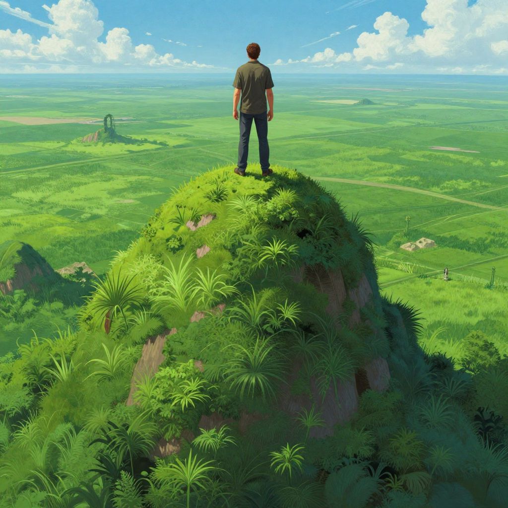 A man standing on top of a lush green field, a detailed matte painting by wlop, cgsociety, fantasy art, reimagined by industrial light and magic, concept art, psychedelic