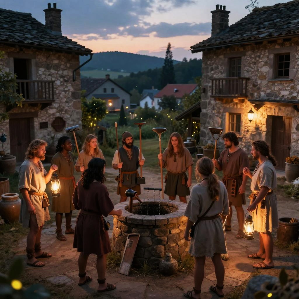 Peasant DnD group of villagers gathered by the well in the town square, wearing homespun garments, holding farming tools and lanterns, old stone buildings around, twilight with glowing fireflies, atmospheric fantasy artwork with soft warm hues.