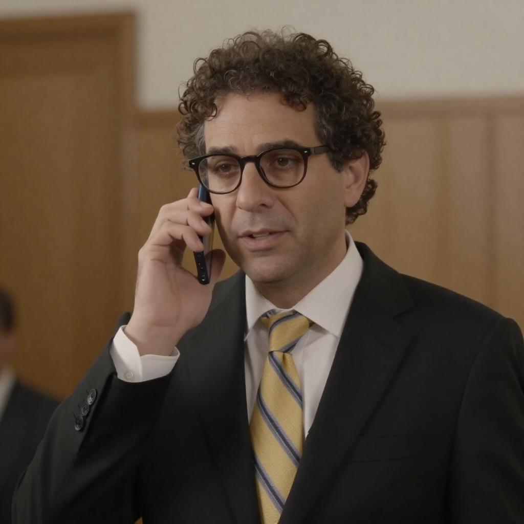 Photograph of a middle-aged man with curly brown hair and glasses, wearing a black suit, white shirt, and yellow-striped tie, talking on a cellphone. He is indoors in a warmly lit, wood-paneled room with blurred background elements.