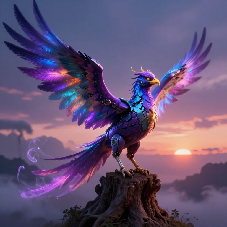 A surreal digital painting depicting an awe-inspiring cybernetic phoenix resting on an aged tree stump, its luminescent wings casting a vibrant spectrum of colors against the twilight sky. The bird's metallic feathers transition from deep purples to shimmering blues, contrasting with the warm amber glow emanating from its sleek, high-tech beak and talons. This scene masterfully combines elements of fantasy and sci-fi, evoking both awe and tranquility as the cybernetic creature surveys its mysterious surroundings from an elevated perspective, surrounded by wisps of ethereal mist that dance playfully among the last rays of sunlight.