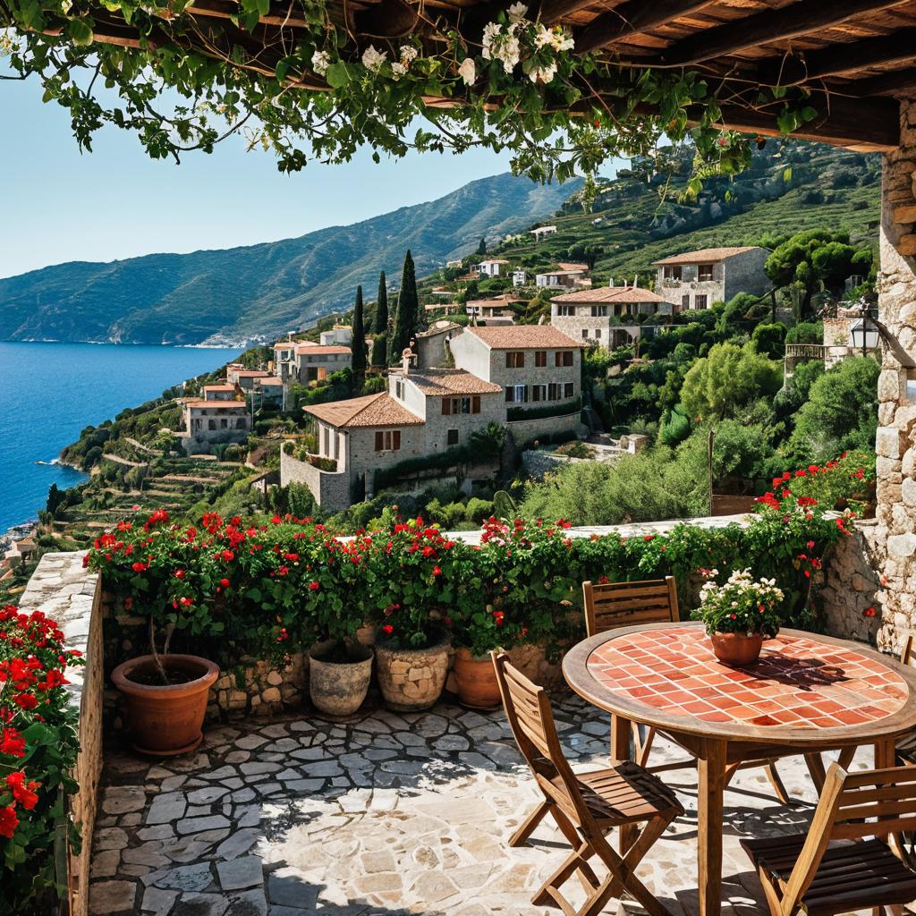 Idyllic mountain village terrace, picturesque Mediterranean setting, stone-built houses with red tiled roofs, flowering climbing vines, rustic wooden furniture, lush greenery, ocean view, high resolution, ultra-detailed