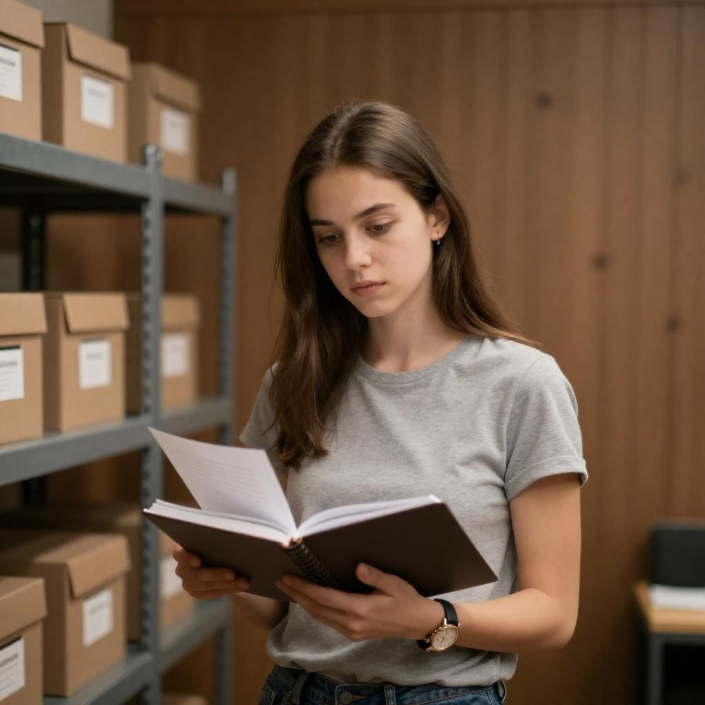 Young woman with long brown hair, wearing a gray t-shirt, holds open a paper and a notebook. She stands in a dimly lit, wooden-paneled room with metal shelves and boxes in the background. She wears a wristwatch on her left wrist. She is focused, with a neutral expression. One shelf is partially visible on the left, filled with labeled boxes. Several stacked boxes are in the background.