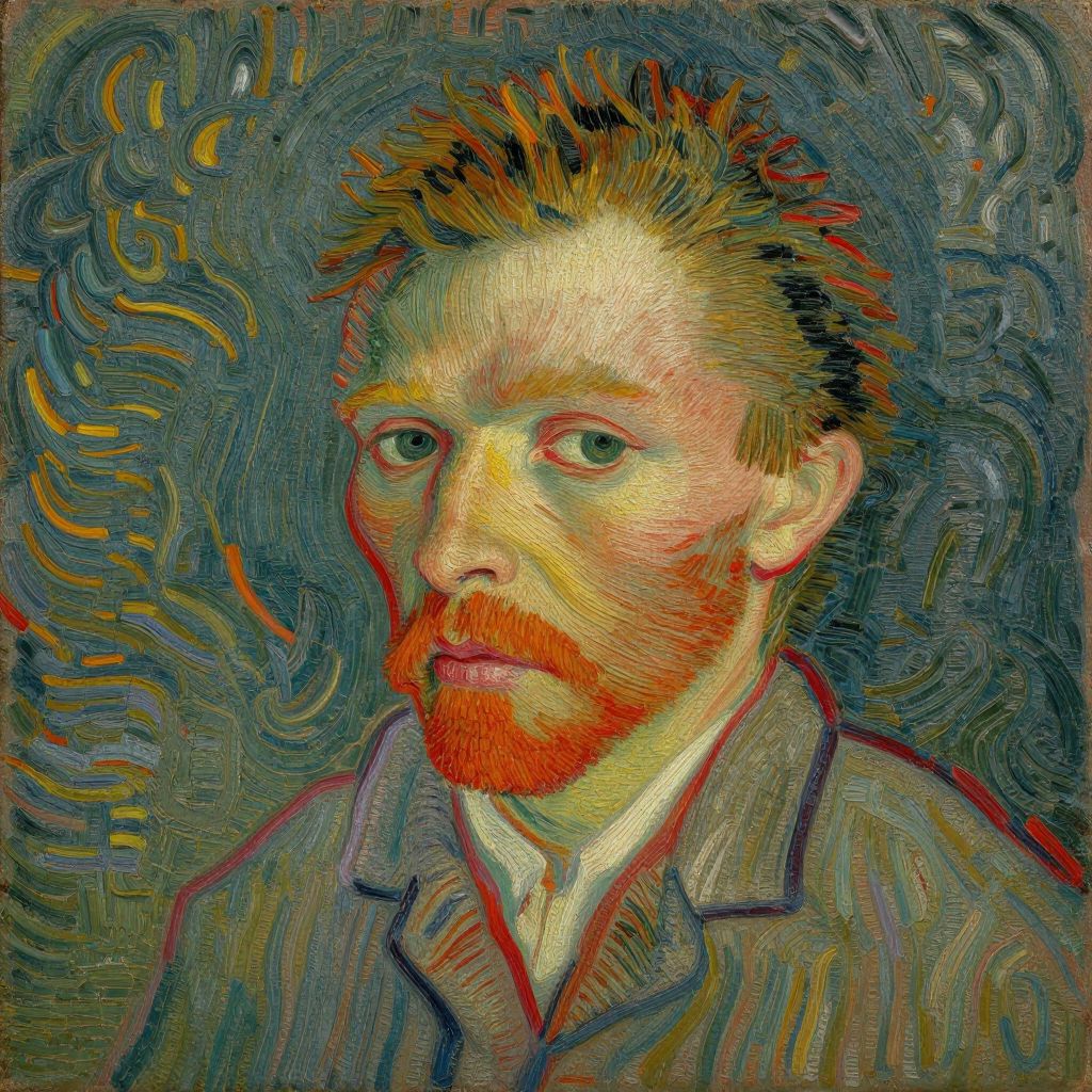 The image presents a striking, impressionistic portrait of a man, rendered in a style reminiscent of Vincent van Gogh's work. The subject's face is the focal point, with a strong emphasis on bold, expressive brushstrokes that convey a sense of movement and energy. The colors are vibrant and dynamic, primarily featuring shades of yellow, red, and black, which create a dramatic contrast and draw the viewer's eye across the canvas. The background is a blend of swirling, textured strokes that add depth and a sense of atmosphere to the portrait. The overall composition is balanced yet dynamic, with the subject's face centrally positioned and the surrounding colors and textures creating a harmonious yet intense visual experience.