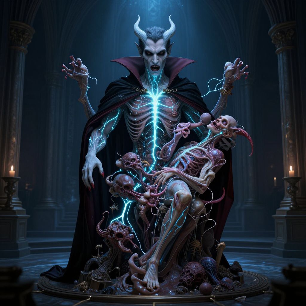 A digital artwork depicts a demonic figure with white, glowing horns, pale skin, and a skeletal frame, seated in a dimly lit, gothic cathedral. The demon wears a black, high-collared cloak, with a bright blue, glowing, skeletal chest. Surrounding the demon are numerous writhing, grotesque, humanoid creatures with exposed bones and twisted limbs, illuminated by the same blue light. The background features tall, arched pillars and two lit candles on either side. The eerie, blue light contrasts sharply with the dark, shadowy surroundings, enhancing the supernatural and ominous atmosphere.