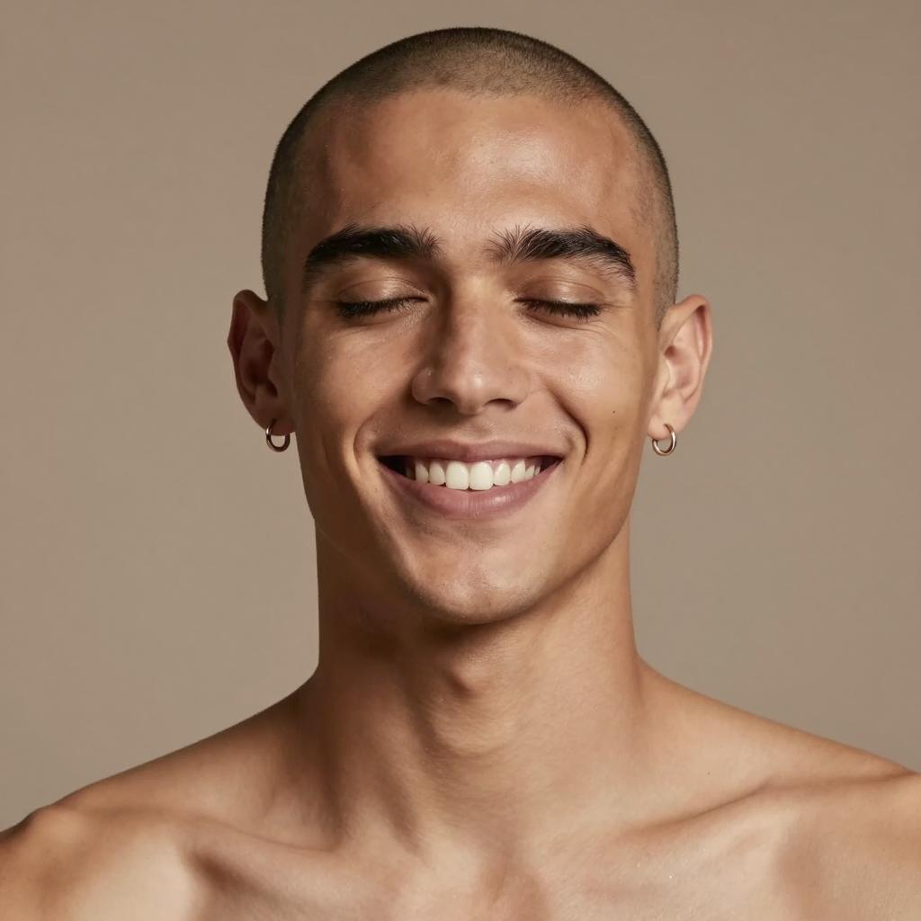 Solo, bald, 1boy, male focus, realistic, collarbone, earrings, jewelry, upper body, nude, simple background, brown background, smile, closed eyes, parted lips, lips