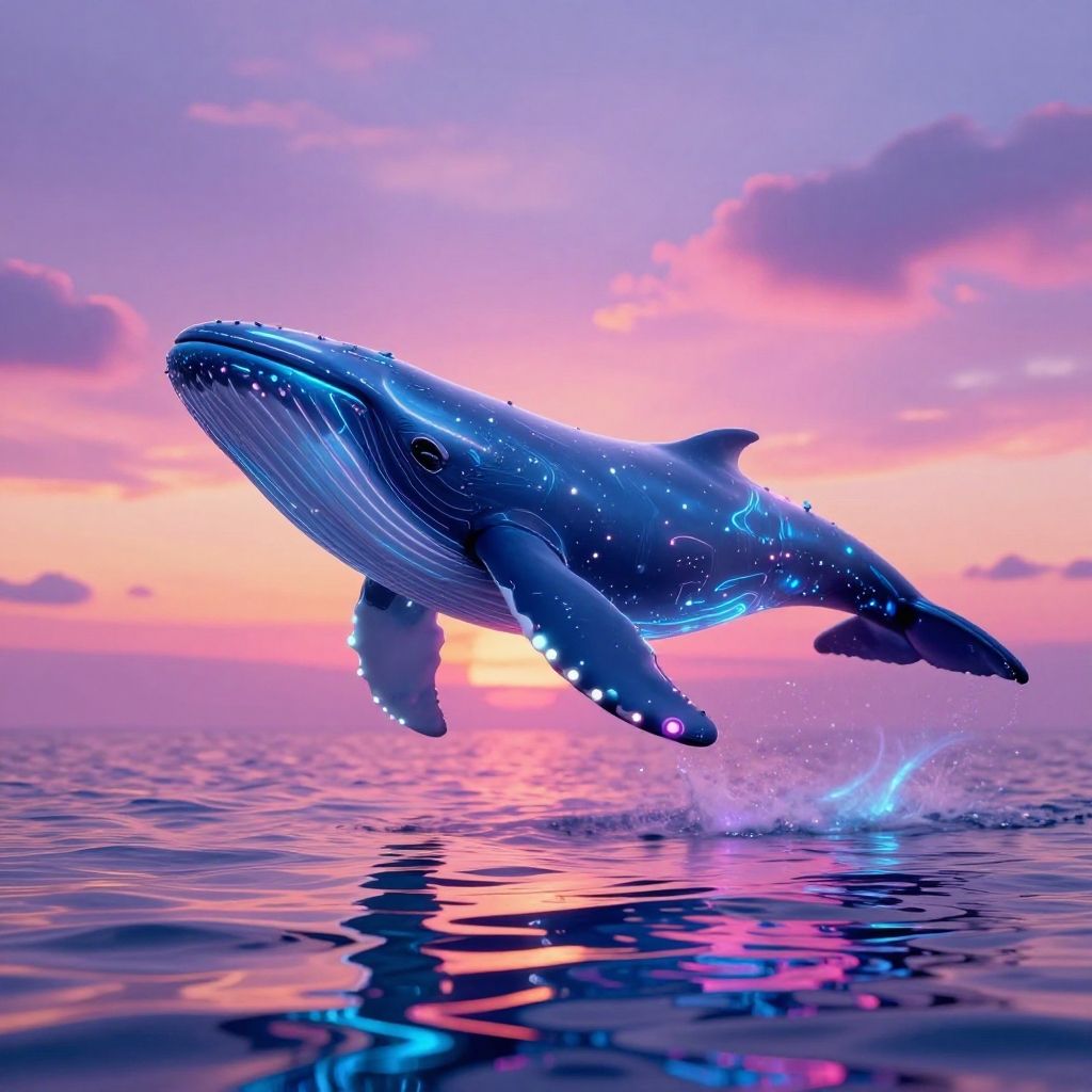 A futuristic synthwave-style glowing cyber whale is shown running free above a neon-lit ocean horizon, featuring pulsing light rings and reflective water with mesmerizing ripple details. The scene is set against a vibrant sunset sky with shades of pink, purple, and orange, combining retro-futuristic and cinematic aesthetics.