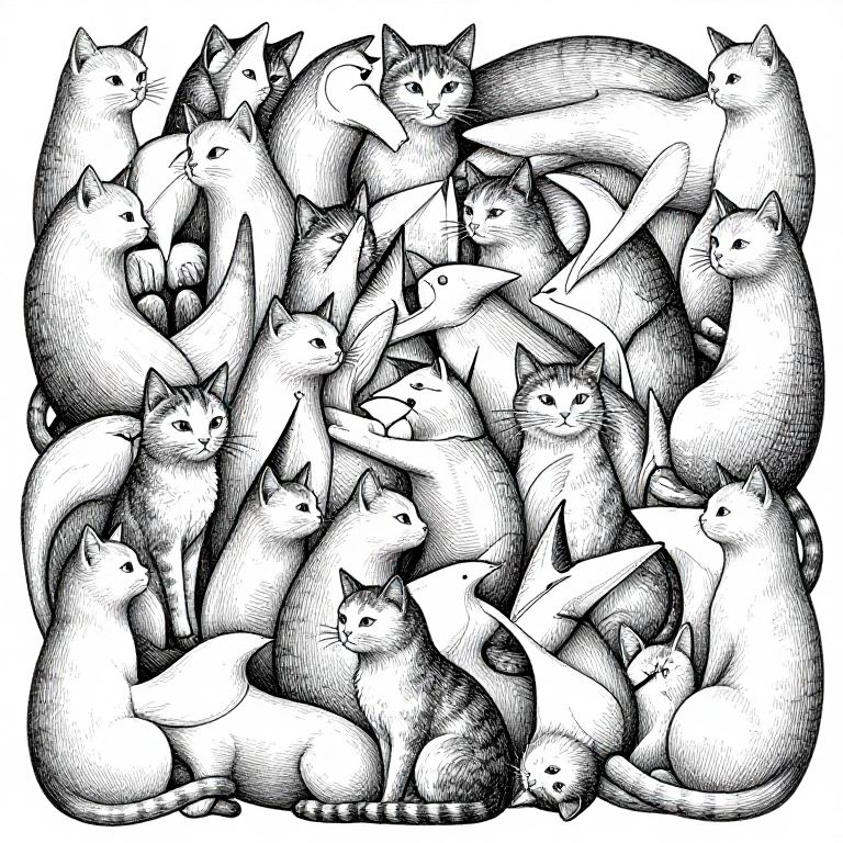 Ink drawing of a dense cluster of black-and-white cats with varied expressions, overlapping and intertwining, creating a textured, chaotic pattern.