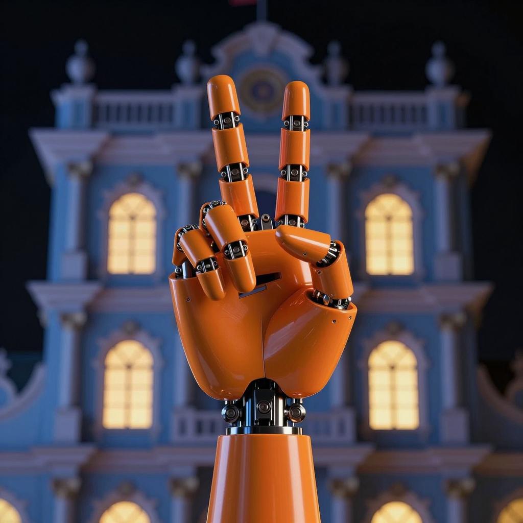 CGI image of a glowing orange, robotic hand with sharp, metallic fingers raised in a peace sign. Background has a blue-lit, ornate building with yellow windows, partially obscured. Black background.