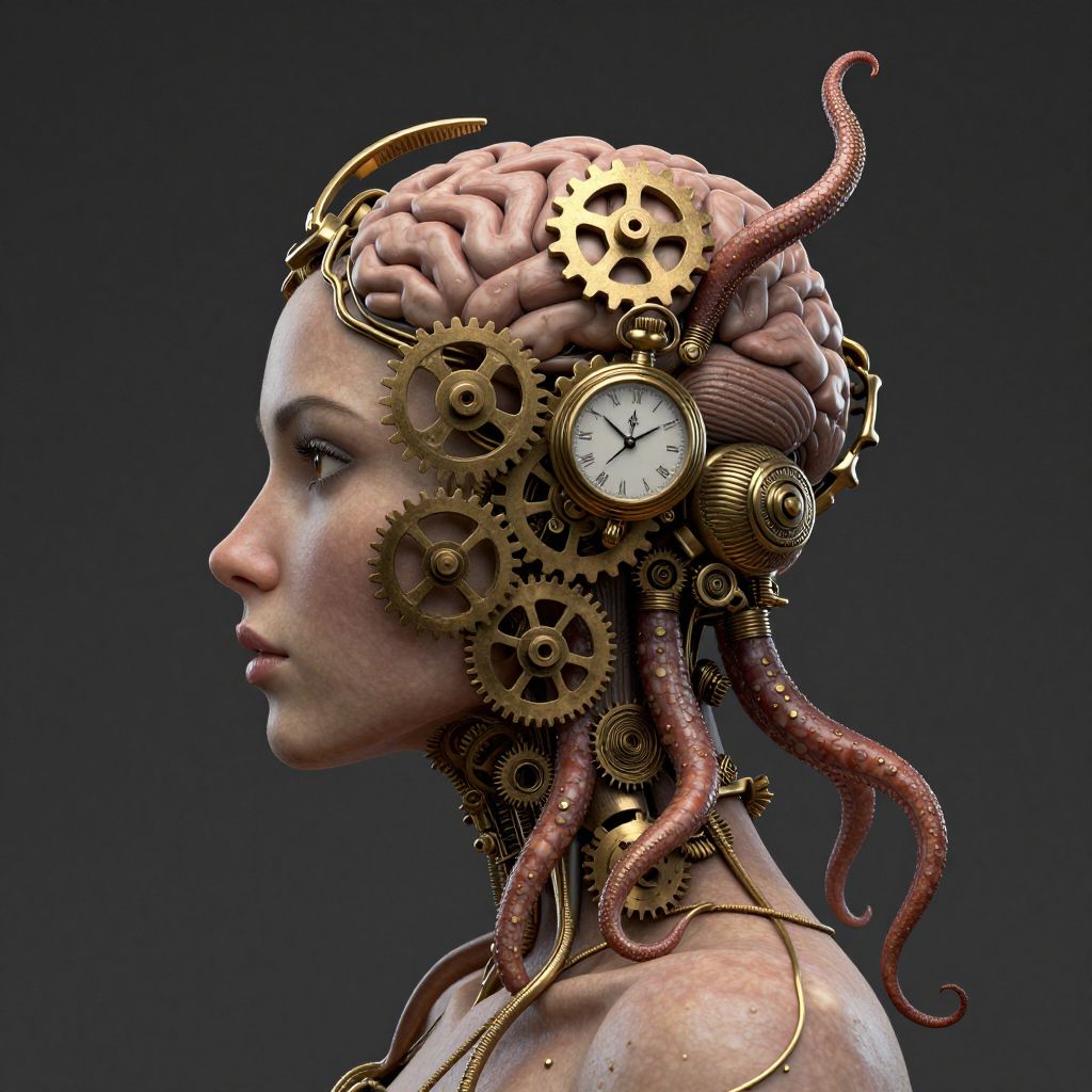 A steampunk-inspired 3D render depicts a surreal fusion of human anatomy and mechanical elements, featuring a woman's profile adorned with intricate brass gears, a vintage pocket watch, and tentacle-like appendages that intertwine with her brain, symbolizing the recalibration of forgotten thoughts.