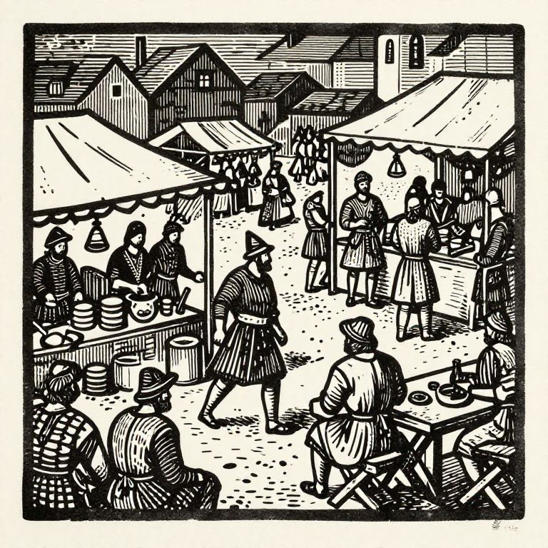 Medieval woodblock prints illustrating a bustling marketplace with merchants and villagers, bold lines, detailed patterns, rustic and historical atmosphere, vintage monochrome aesthetic