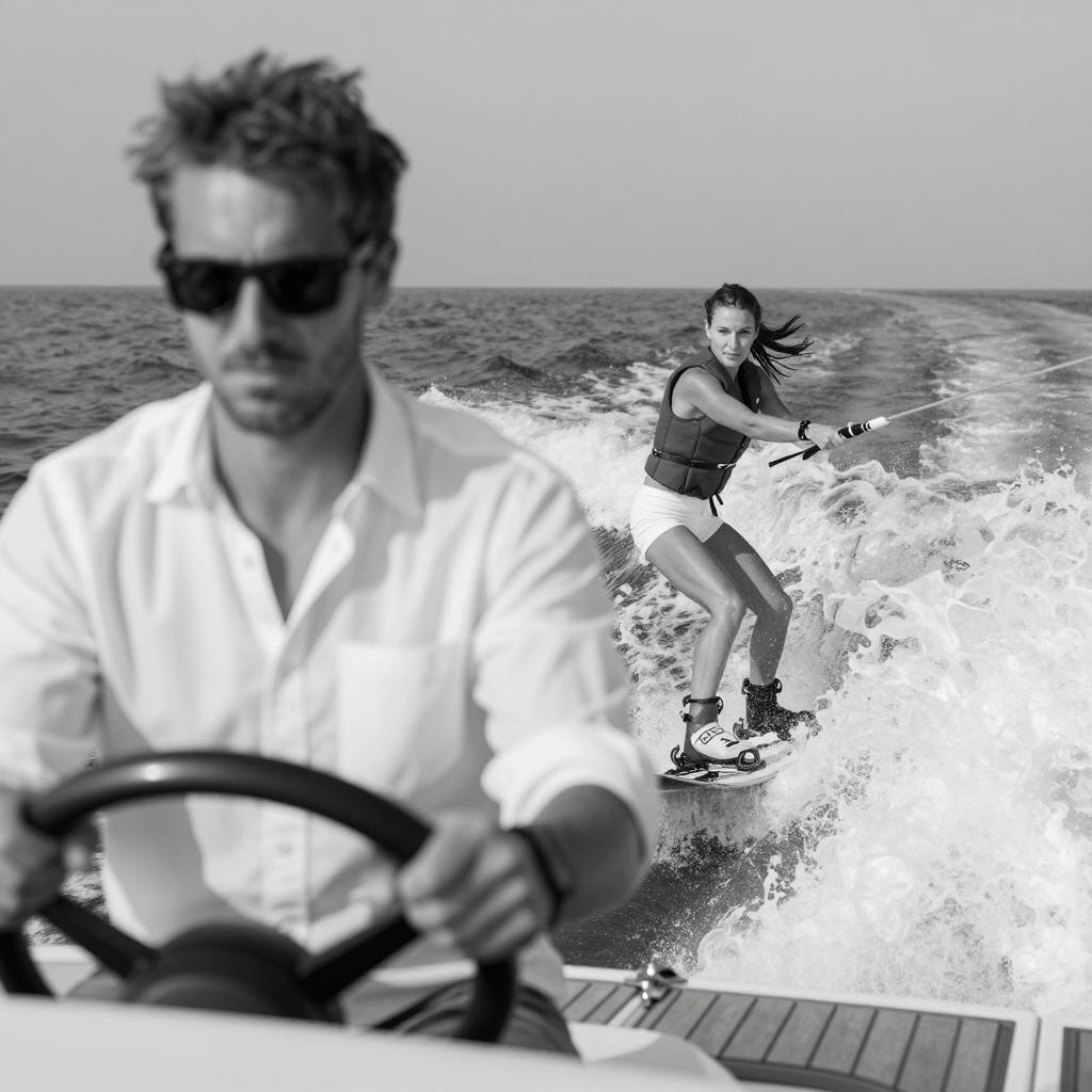 Woman with curly brown hair, wearing a white jacket and gray pants, holds a sailboat winch with her right hand while seated on a white sailboat deck. Dark, cloudy sky in the background. Wooden cabinetry on the left. Sailing boat is on open ocean. White mast in the background. One person. Intense facial expression.