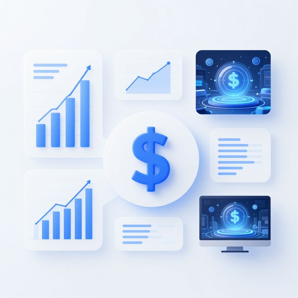 This digital illustration features a white background with blue financial and technological elements. Central is a large blue dollar sign on a white circle. To the left, there are two blue bar charts with ascending lines, indicating growth. To the right, there are two blue screens displaying a glowing blue dollar sign with digital patterns. Below each screen, there are blue lines resembling text. The overall style is modern and minimalist, emphasizing financial growth and technological integration. The image uses a monochromatic blue color scheme with white accents.