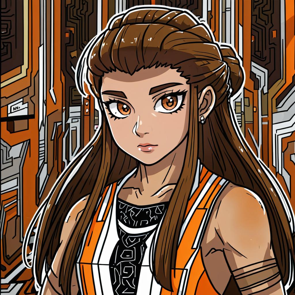 Illustration of an anime-style girl with long brown hair styled in a half updo. She has large brown eyes and is wearing a sleeveless orange and white outfit with a black patterned top underneath. The background features an abstract design with orange, brown, and gray geometric shapes.