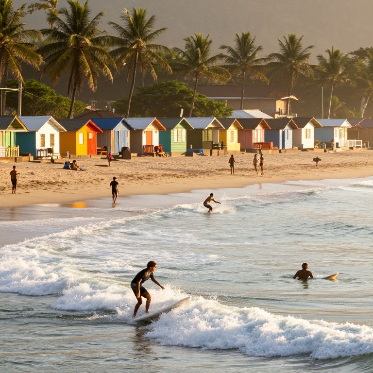 Photograph of a sunset beach with colorful beach huts, palm trees, surfers riding waves, and people walking along the shore.